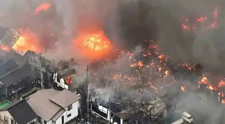 A massive fire swept through a Japanese city, resulting in one fatality and causing extensive destruction to roughly 170 buildings, leaving widespread devastation and prompting urgent emergency response efforts today.
