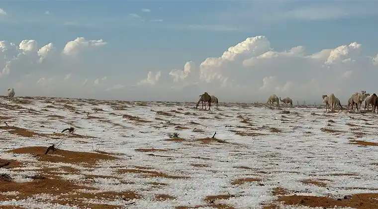 In recent months, several winter systems have created scenes that many residents likened to snowfall. During periods of intense rainfall accompanied by cold air, hail accumulated across stretches of desert and open land, temporarily transforming the normally golden sand into white-covered landscapes. Social media was flooded with images and videos showing what appeared to be snow-covered ground, even though the phenomenon was caused entirely by hail. These moments sparked excitement and curiosity, particularly among younger residents who had never witnessed anything similar.